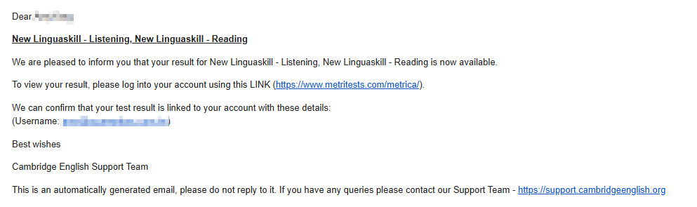 測驗結束後3-5個工作天內,考生將會收到主旨開頭為 Result availability for New Linguaskill的E-mail,E-mail中會顯示您的登入帳號(Username)。若未收到通知,請檢查垃圾信件 。