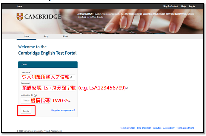 備註:請注意,密碼已設為預設密碼。請勿使用Forgotten your password「忘記密碼」功能,因為這會導致登入失敗。