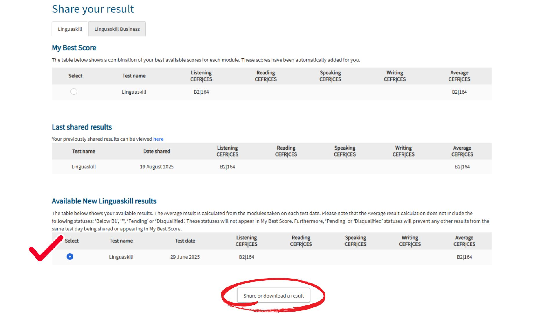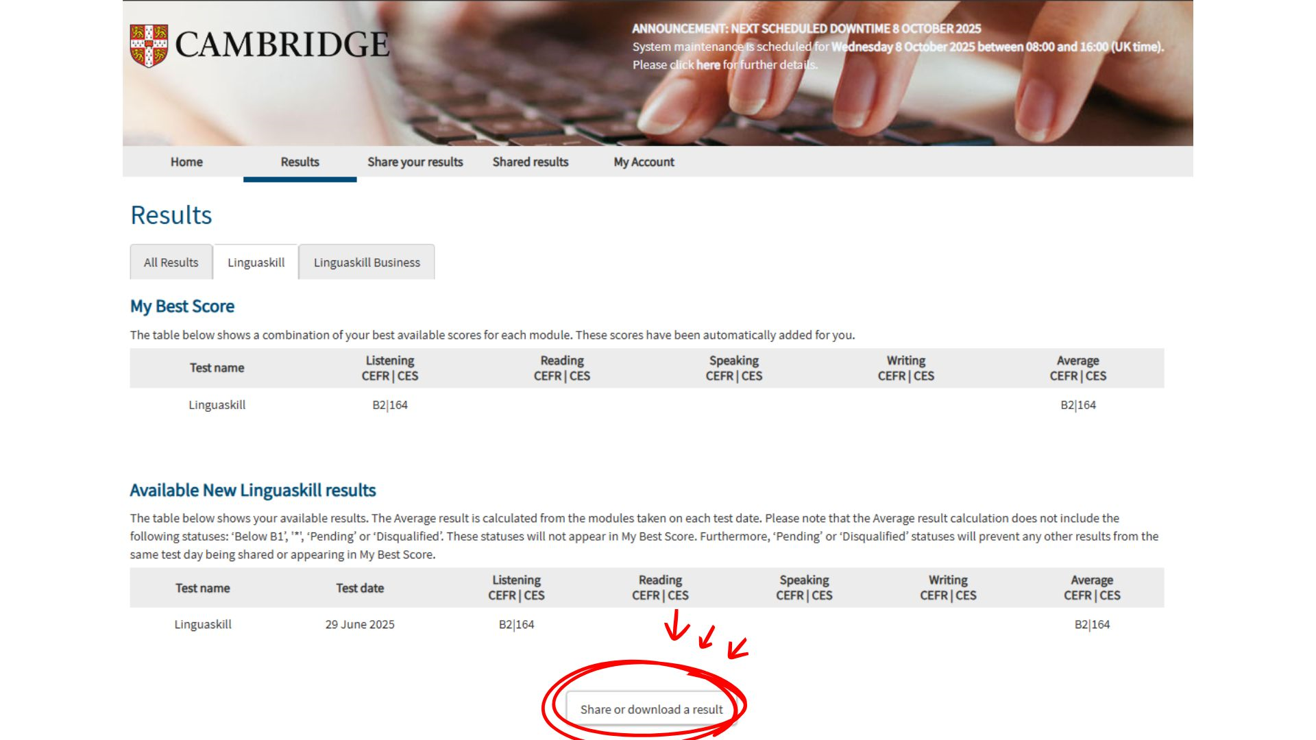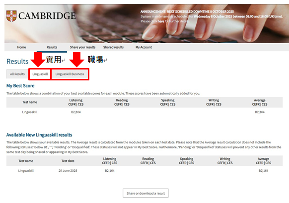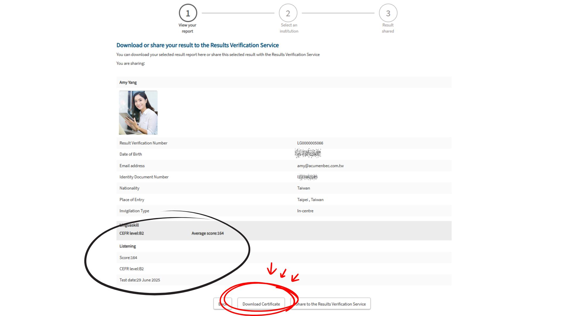 注意: 若成績顯示Below B1,即無法產生成績單亦無法點擊「share or download a result」按鈕