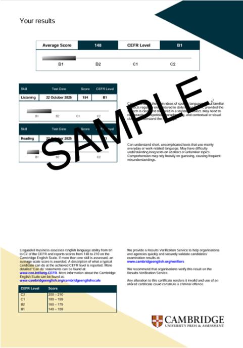 Linguaskill Business 劍橋領思-職場英語、Linguaskill General 劍橋領思-實用英語的聽力、閱讀、口說及寫作測驗的成績呈現方式皆相同。